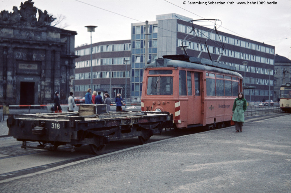 Arbeitstriebwagen 301III (ex Tw 137, Typ ET 50, Baujahr 1951) zusammen mit der Lore 318I (ex Berln G 342, ex ABw 50, Baujahr 1923)