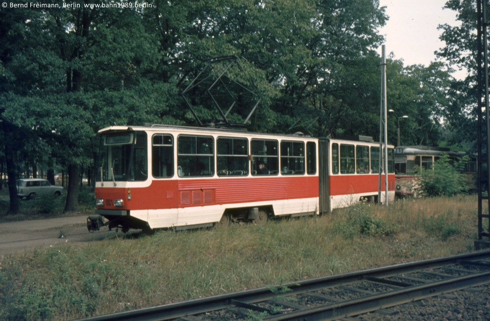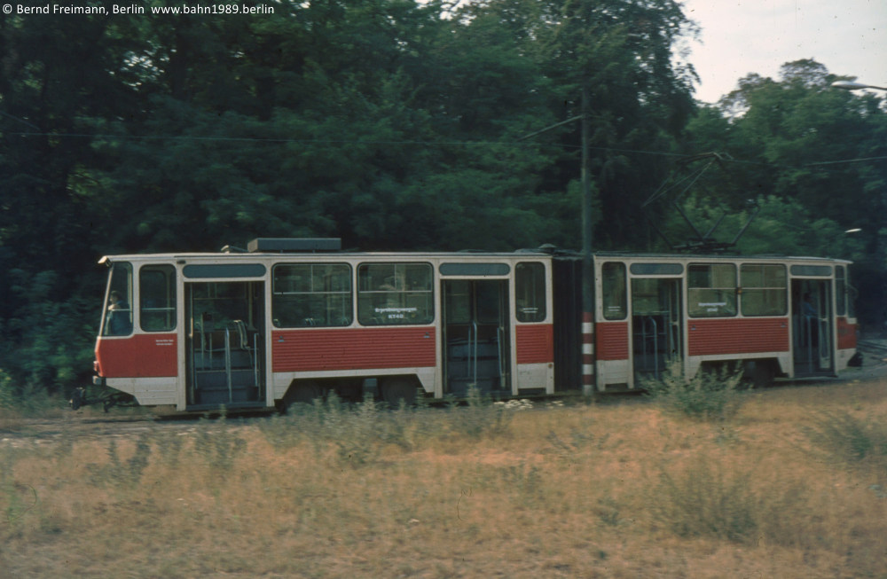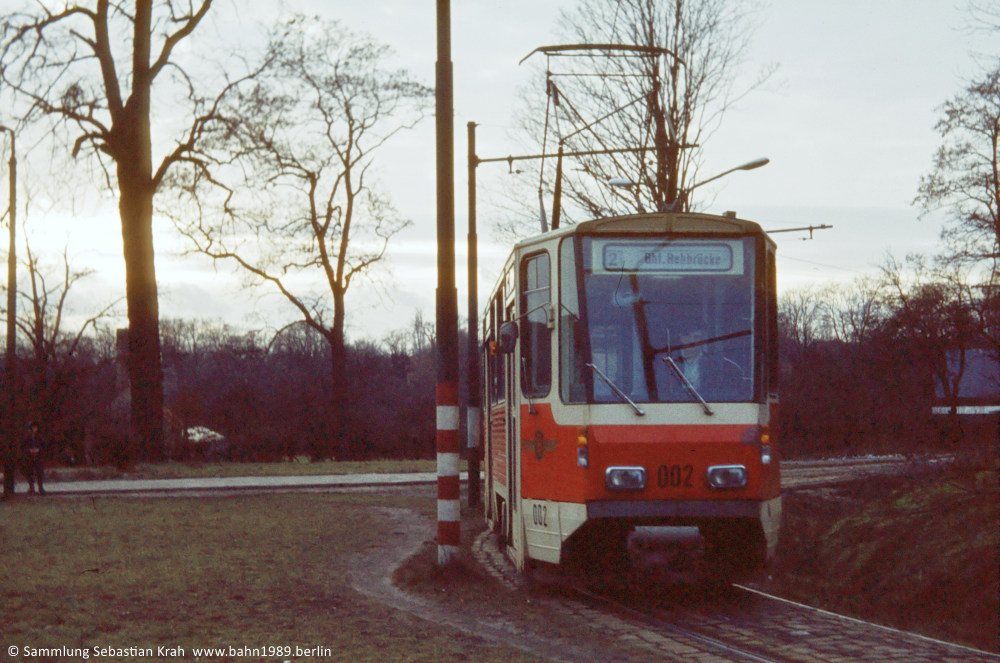 Von der Langen Brücke nähert sich der KT4D-Prototyp 002 der Haltestelle Ernst-Thälmann-Stadion.