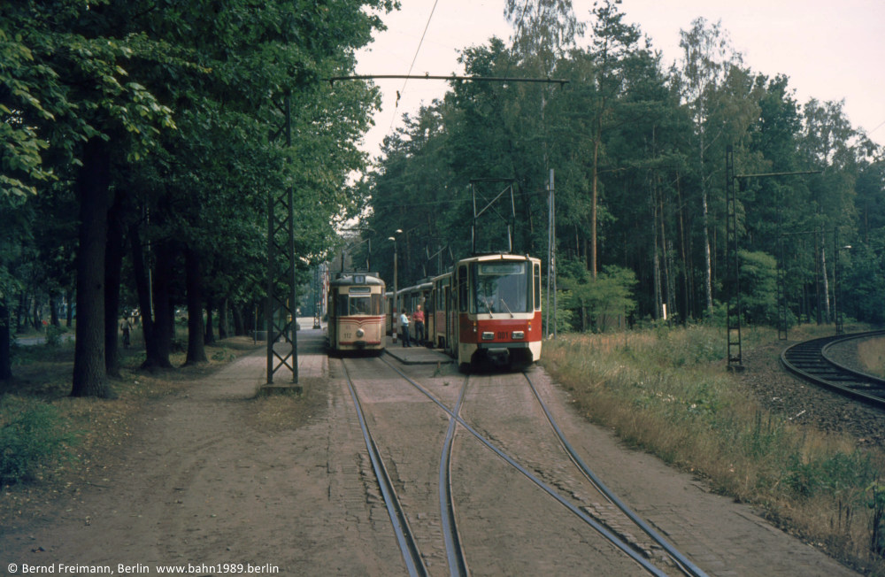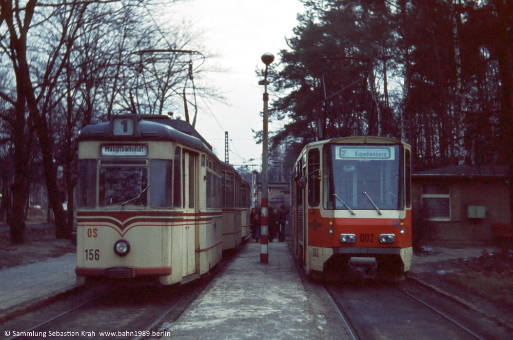 In den Aufstellgleisen der Endhaltestelle Bf. Rehbrücke stehen ein Zug der Linie 1 zum Hauptbahnhof, gebildet aus Gotha-Tw 156 und den beiden ex-Berliner