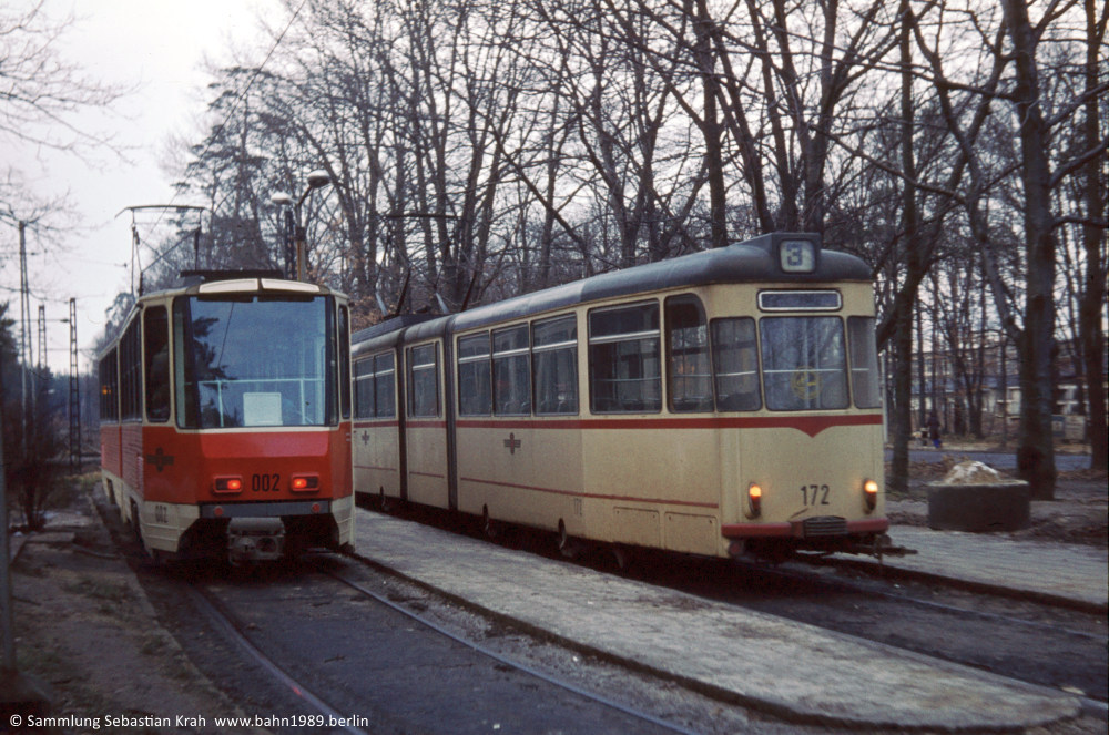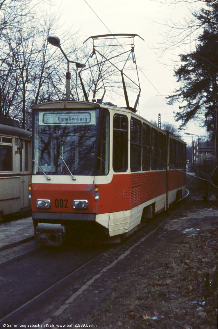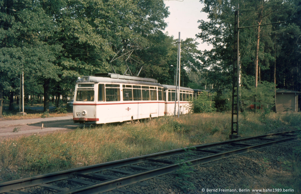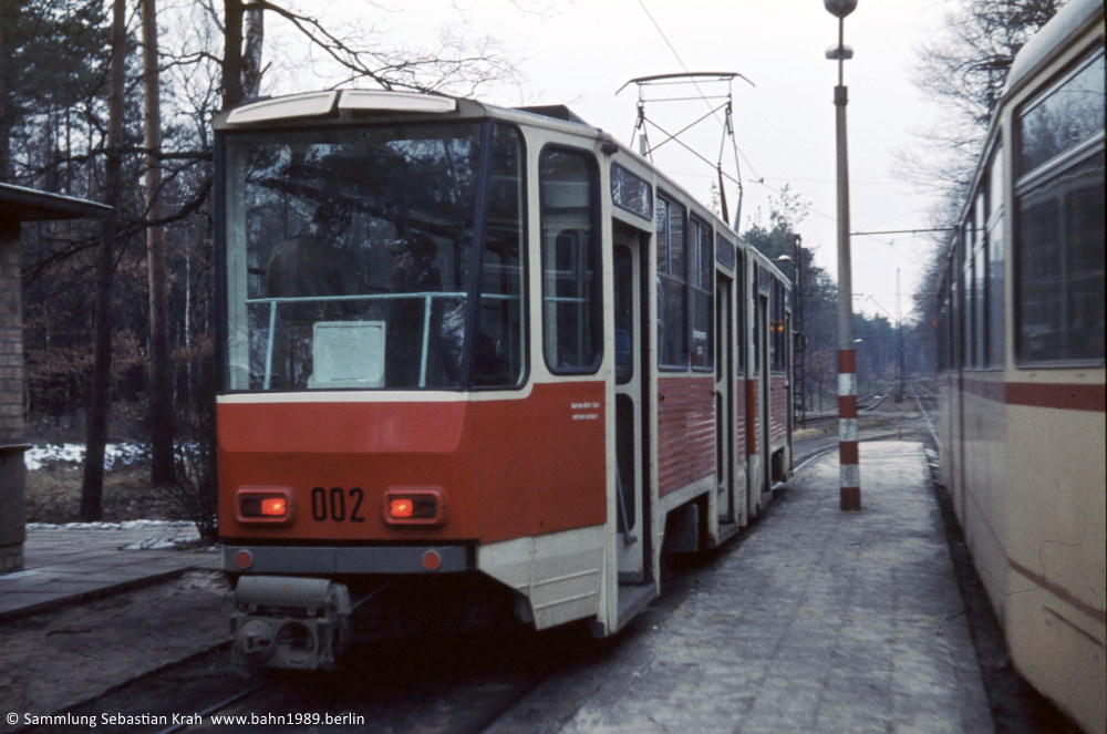 Neben der Türseite des Tw 002 aus der ungewöhnlichen Perspekte von hinten ist im Hintergrund sehr gut der damalige Streckenverlauf vor der Endhaltestelle Bf. Rehbrücke zu sehen.