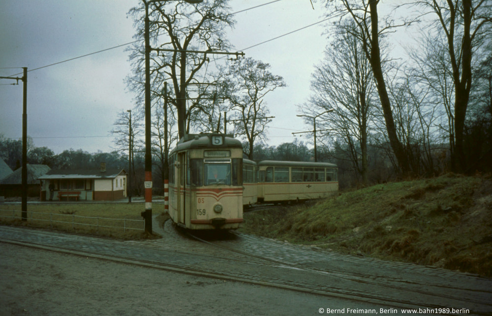 Im Wendedreieck am Kapellenberg schiebt Tw 159, eingesetzt auf der Linie 5, seinen Zug rückwärts.