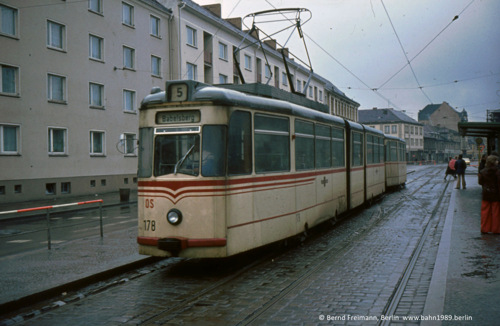 Gelenkwagen 178 zusammen mit einem unbekannten Beiwagen auf der Linie 5 am Platz der Einheit / West auf der Fahrt nach Babelsberg.