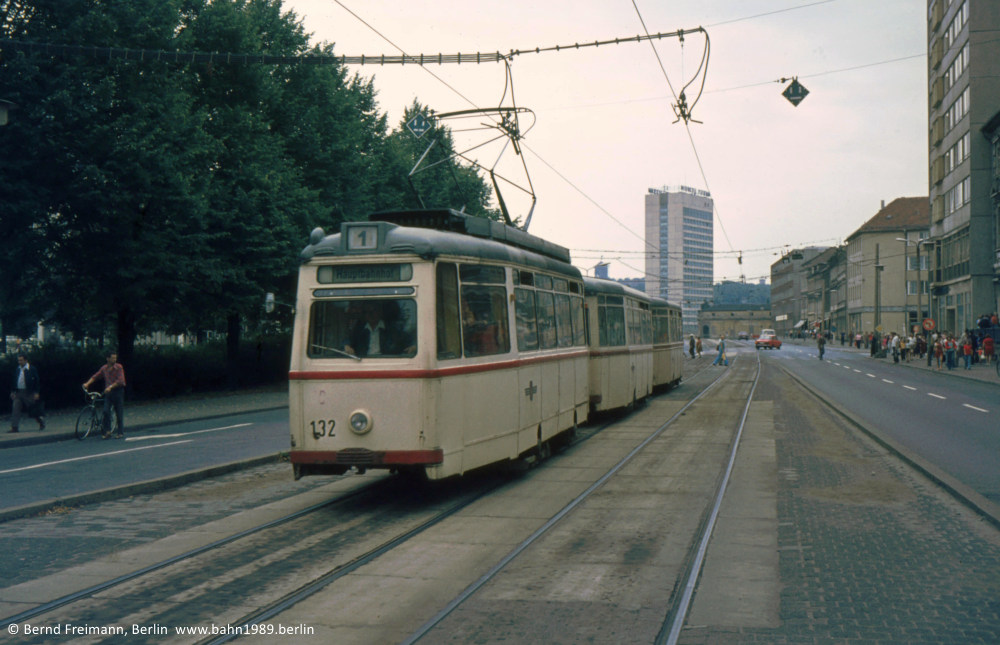 Auf der Linie 1 war der Tw 107 vermutlich zusammen mit den Bw 213 und 214 unterwegs, ebenfalls am Platz der Einheit / West aufgenommen.