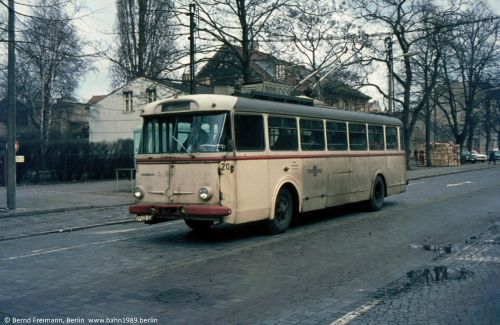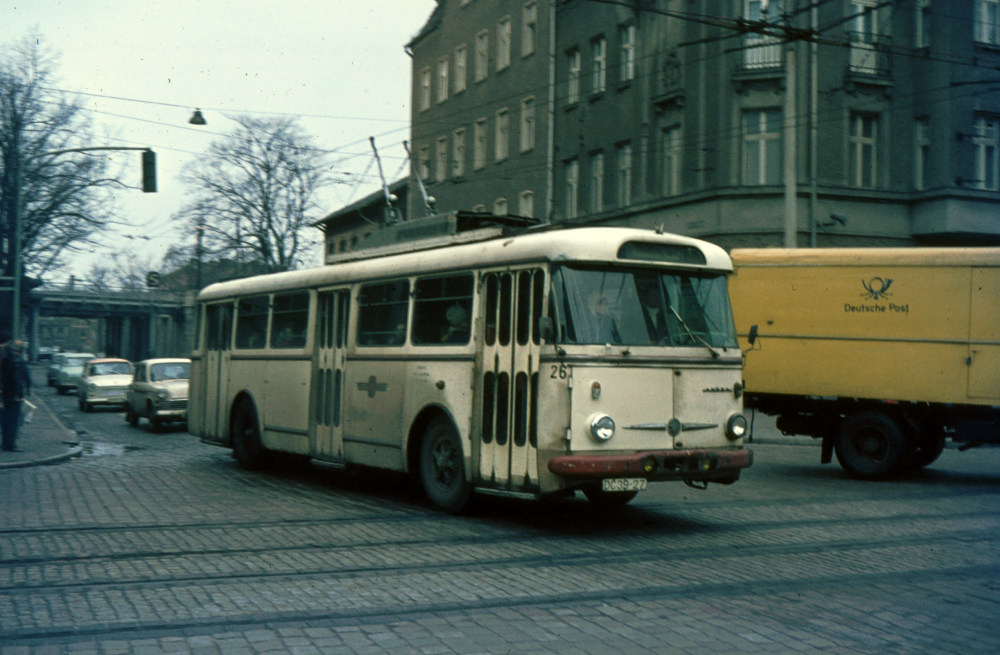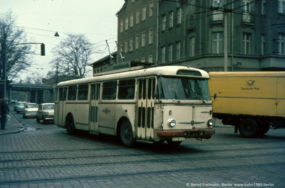 Die Straßenbahngleise in Babelsberg kreuzte an dieser Stelle der O-Bus-Verkehr, hier Škoda 9Tr Wagen Nr. 26 auf der Fahrt nach Babelsberg Nord.