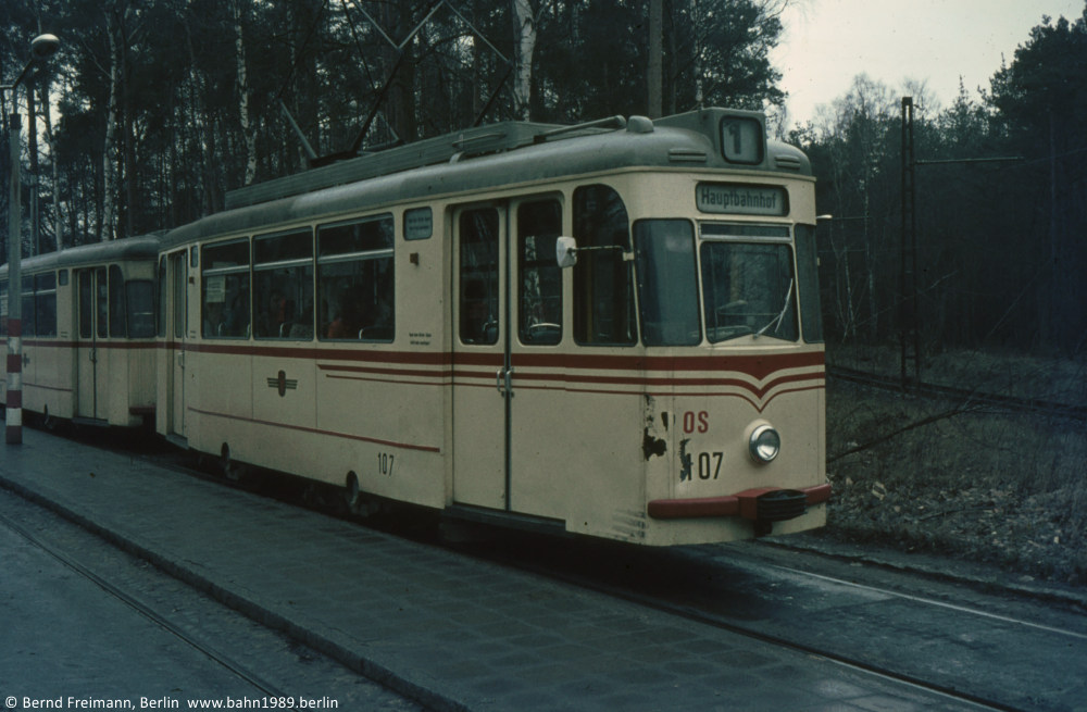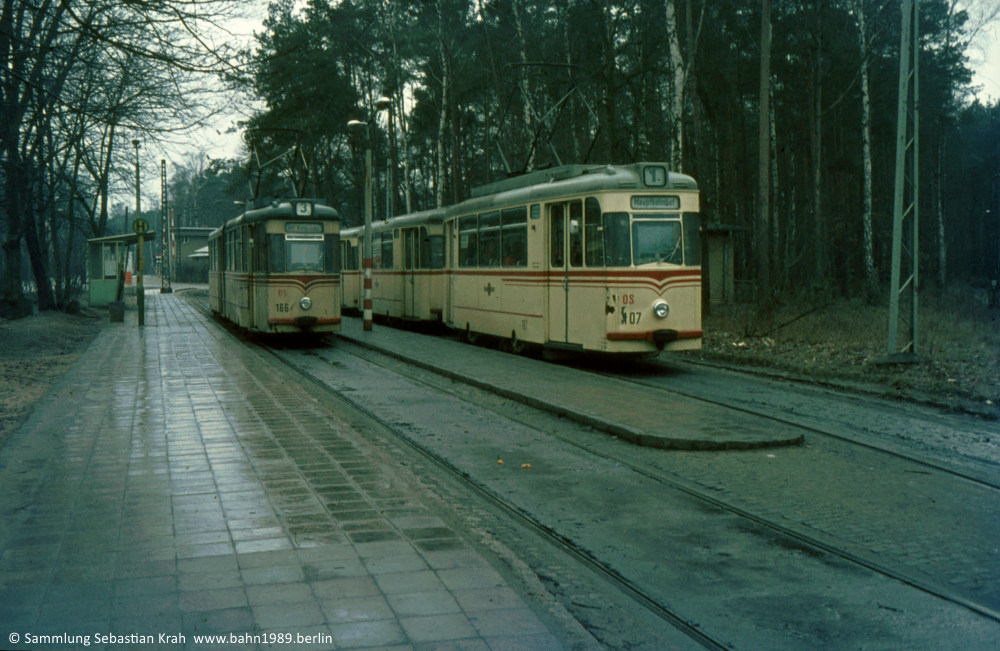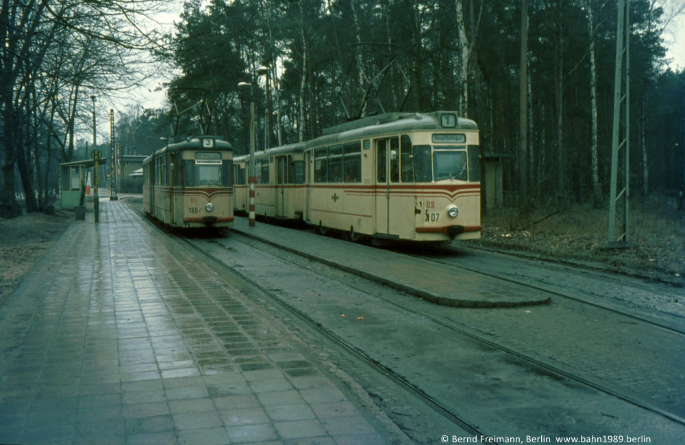 Am Bf. Rehbrücke sind auf den Aufstellgleisen Tw 166 auf der Linie 3 (links) und Tw 107 auf der Linie 1 (rechts) fotografiert worden.