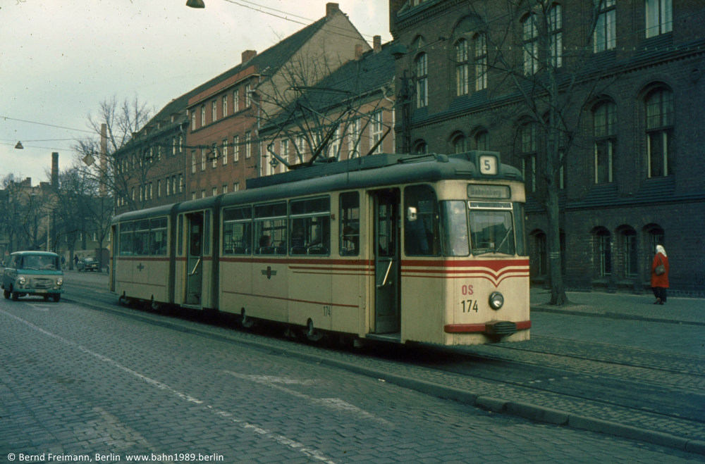 Gotha-Gelenkwagen 174 ist auf der Linie 5 nach Babelsberg eingesetzt und steht hier an der Haltestelle Kulturhaus Herbert Ritter.