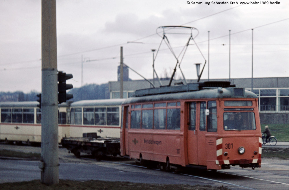 Arbeitstriebwagen 301III (ex Tw 137, Typ ET 50, Baujahr 1951) zusammen mit der Lore 318I (ex Berln G 342, ex ABw 50, Baujahr 1923)