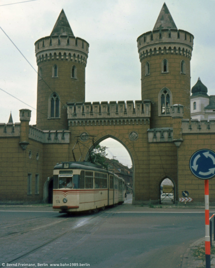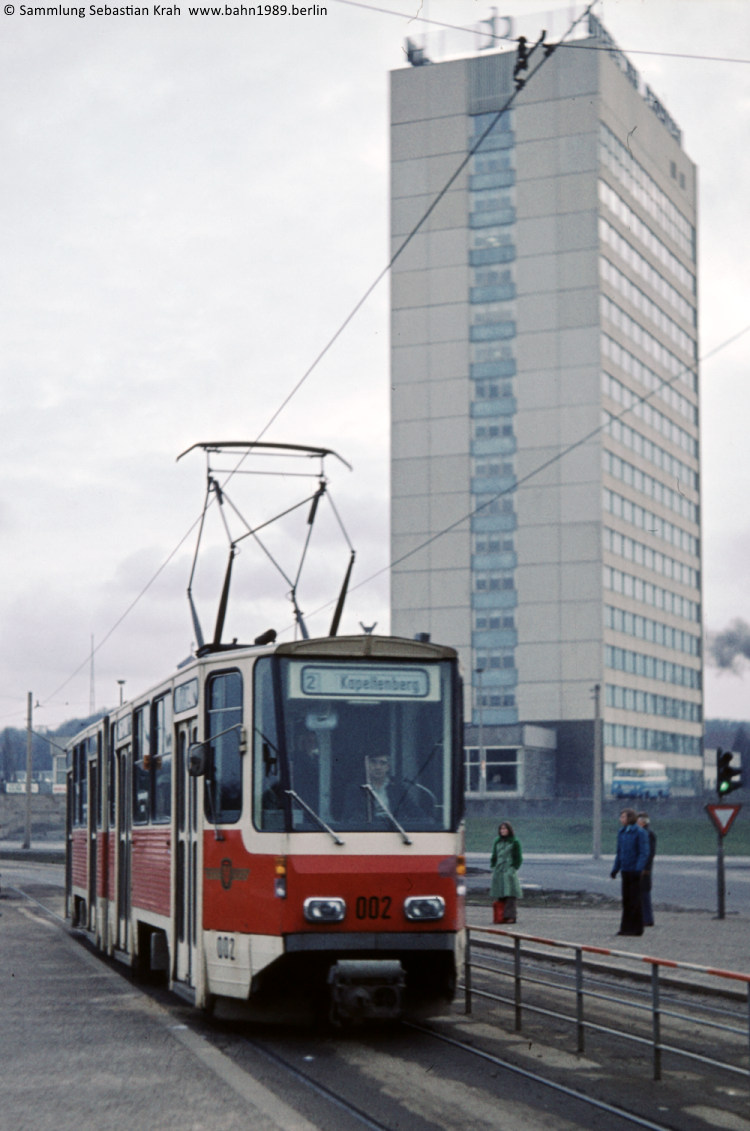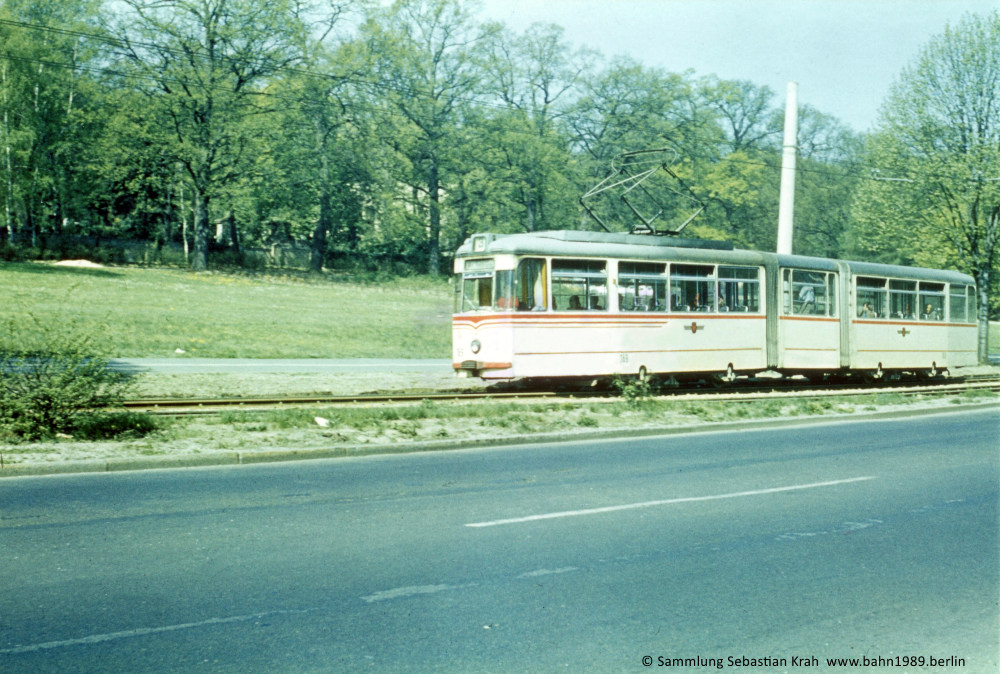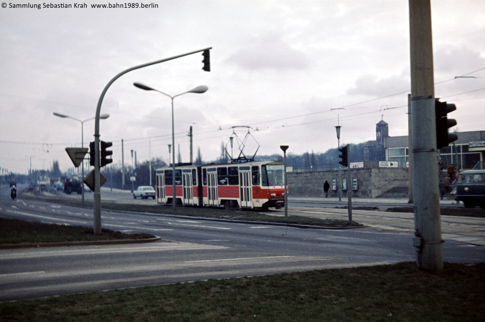 Von der Langen Brücke nähert sich der KT4D-Prototyp 002 der Haltestelle Ernst-Thälmann-Stadion.