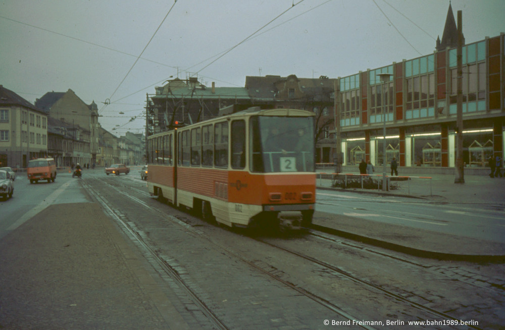 KT4D 002 war erneut als Kurs der Linie 2 eingesetzt, hier am Platz der Einheit / West auf der Fahrt zum Kapellenberg. Rechts das