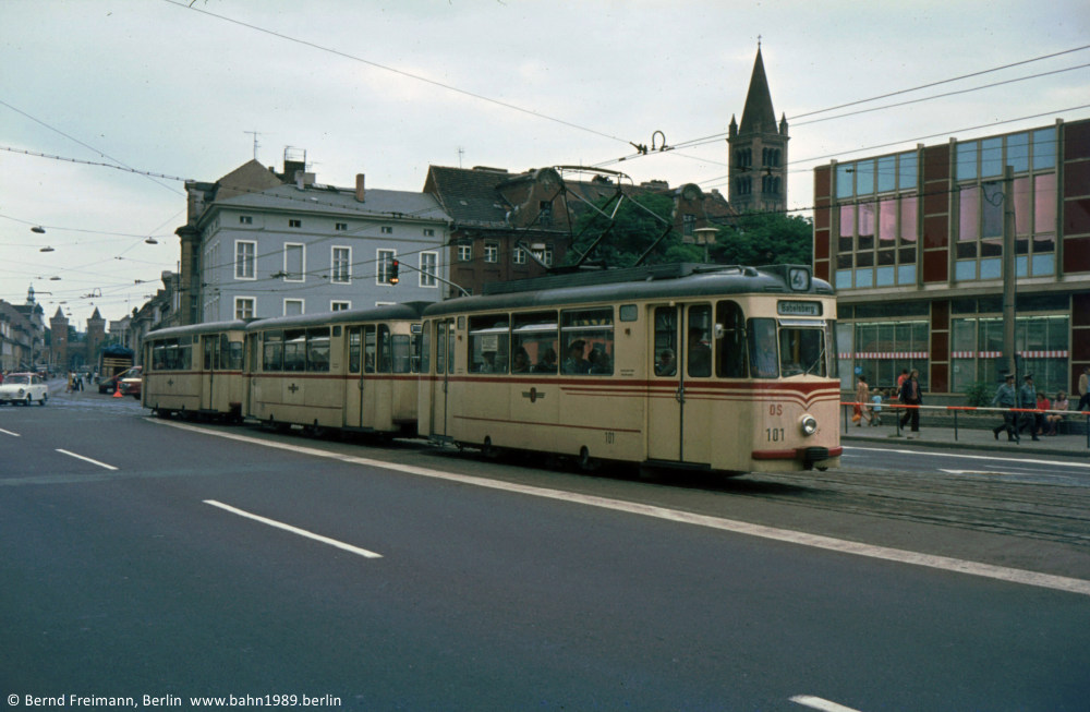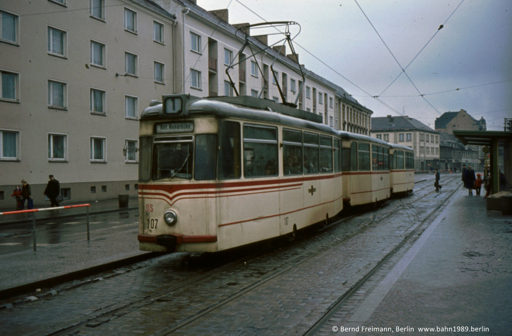 Auf der Linie 1 war der Tw 107 vermutlich zusammen mit den Bw 213 und 214 unterwegs, ebenfalls am Platz der Einheit / West aufgenommen.