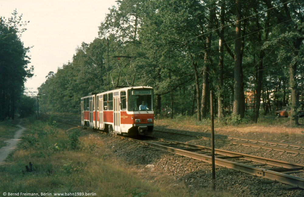 Neben der Türseite des Tw 002 aus der ungewöhnlichen Perspekte von hinten ist im Hintergrund sehr gut der damalige Streckenverlauf vor der Endhaltestelle Bf. Rehbrücke zu sehen.