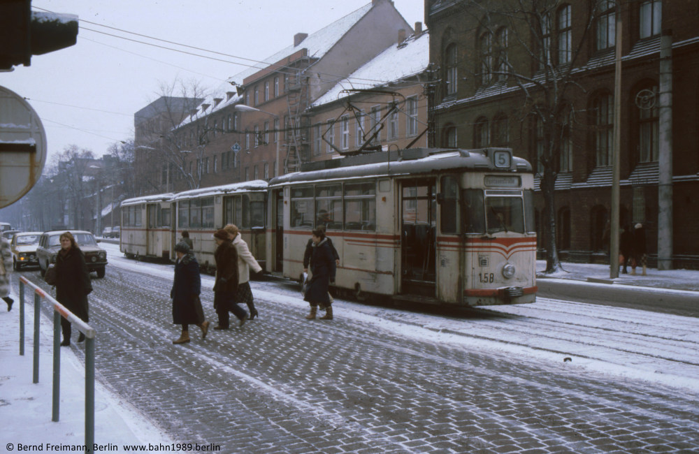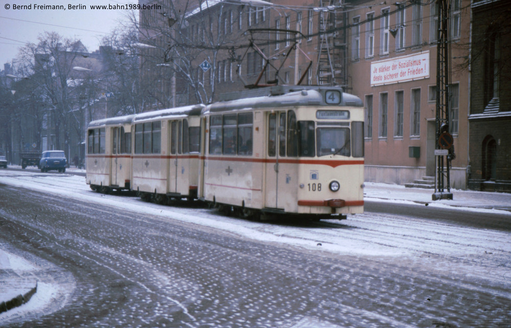 Gotha-Zug 158+213+214 auf der Linie 5 an der Haltestelle „Kulturhaus Herbert Ritter“ am 20. November 1985. Sie spiegeln den schlechten Zustand eines großen